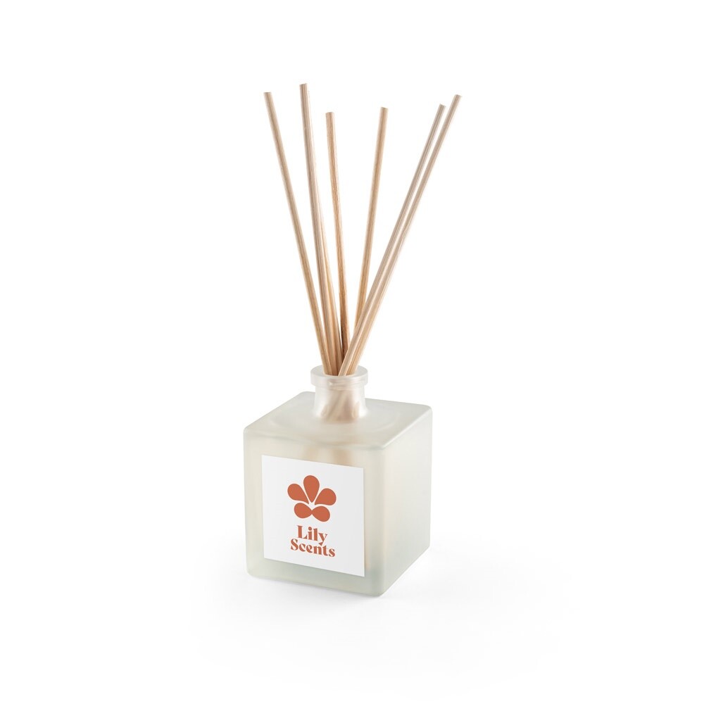 Scent diffuser in a glass bottle with a lid. The diffuser rods are made of rattan - a natural fibre perfect for diffusing fragrances. Quantity up to 100 mL. Made in Europe. Supplied in an individual gift box. As the product is made from natural materials, the colour and the printing result may vary between products.Colour 104 - Red fruitsColour 106 - White musk 55 x 55 x 90 mm | Box: 60 x 63 x 197 mm