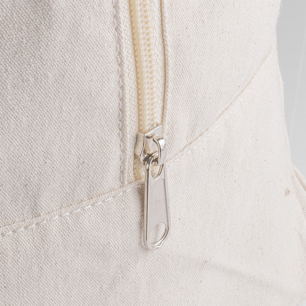 Bolso en material 100% algodón con acabado en color natural. Con asas de algodón reforzadas para hombro alrededor de toda la bolsa en variada gama de vivos colores. Cierre de cremallera.