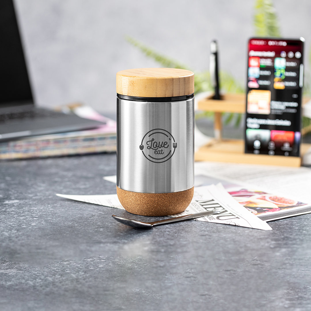 Fiambrera de línea nature y 450 ml de capacidad. Cuerpo en acero inox, con base de corcho para mantener la temperatura y tapón de seguridad en bambú, con accesorio de fijación para la cuchara de acero inox (incluida). Presentada en caja individual de diseño eco en cartón kraft. 450 ml
