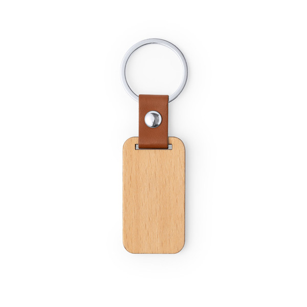 Llavero de línea nature fabricado en madera natural, con original cinta en polipiel marrón y remache cromado. Disponible en diseños rectangular y circular.