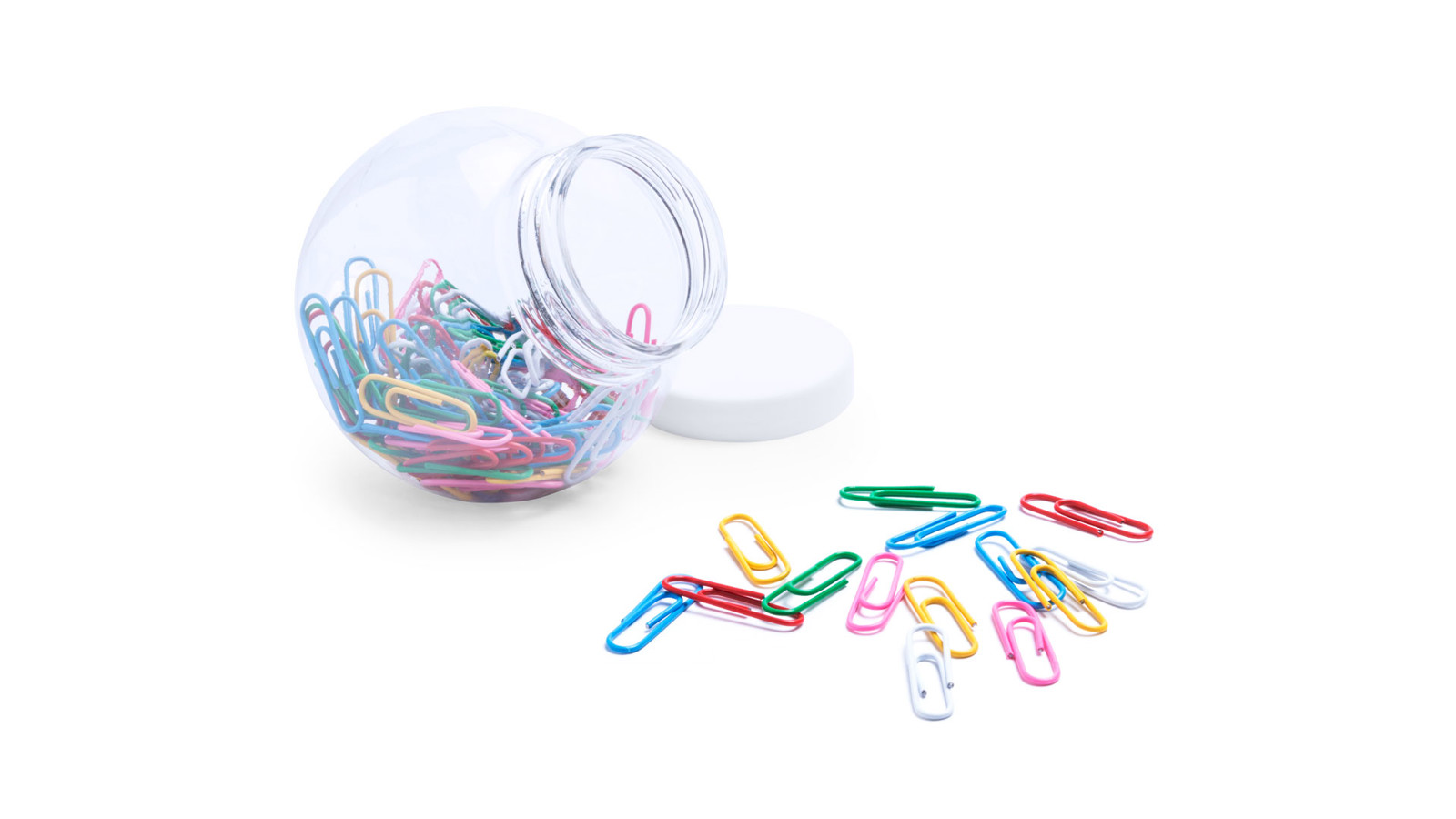 Original bote porta clips de cuerpo transparente y tapa blanca a rosca con superficie lisa para marcaje. Con 100 clips multicolor recubiertos en PVC incluidos. 100 Clips Incluidos