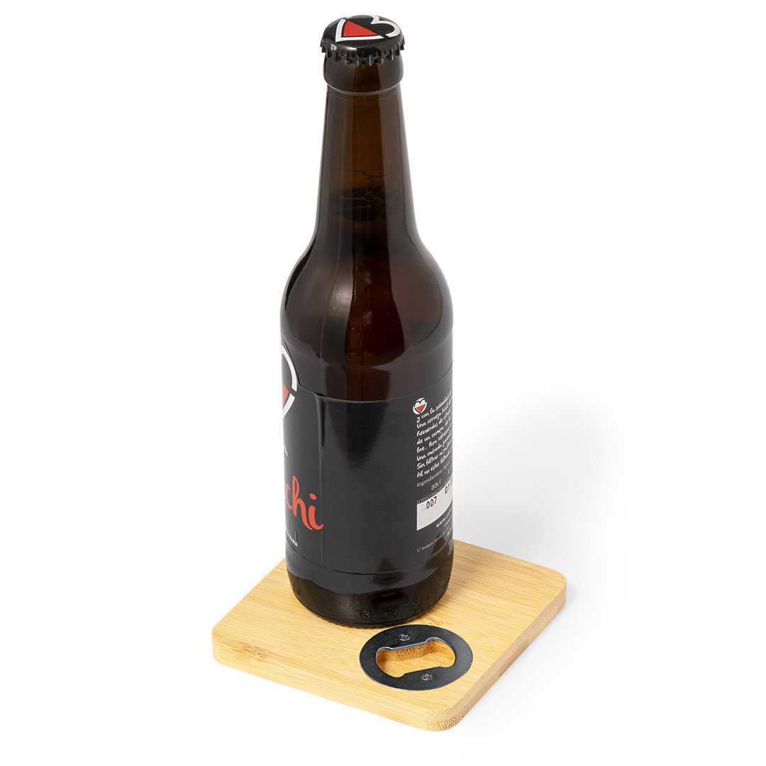 Práctico posavasos fabricado en bambú con abridor integrado, ideal para disfrutar de bebidas protegiendo la superficie y con el abrebotellas incorporado siendo un complemento versátil. Presentado individualmente en caja de diseño kraft.
