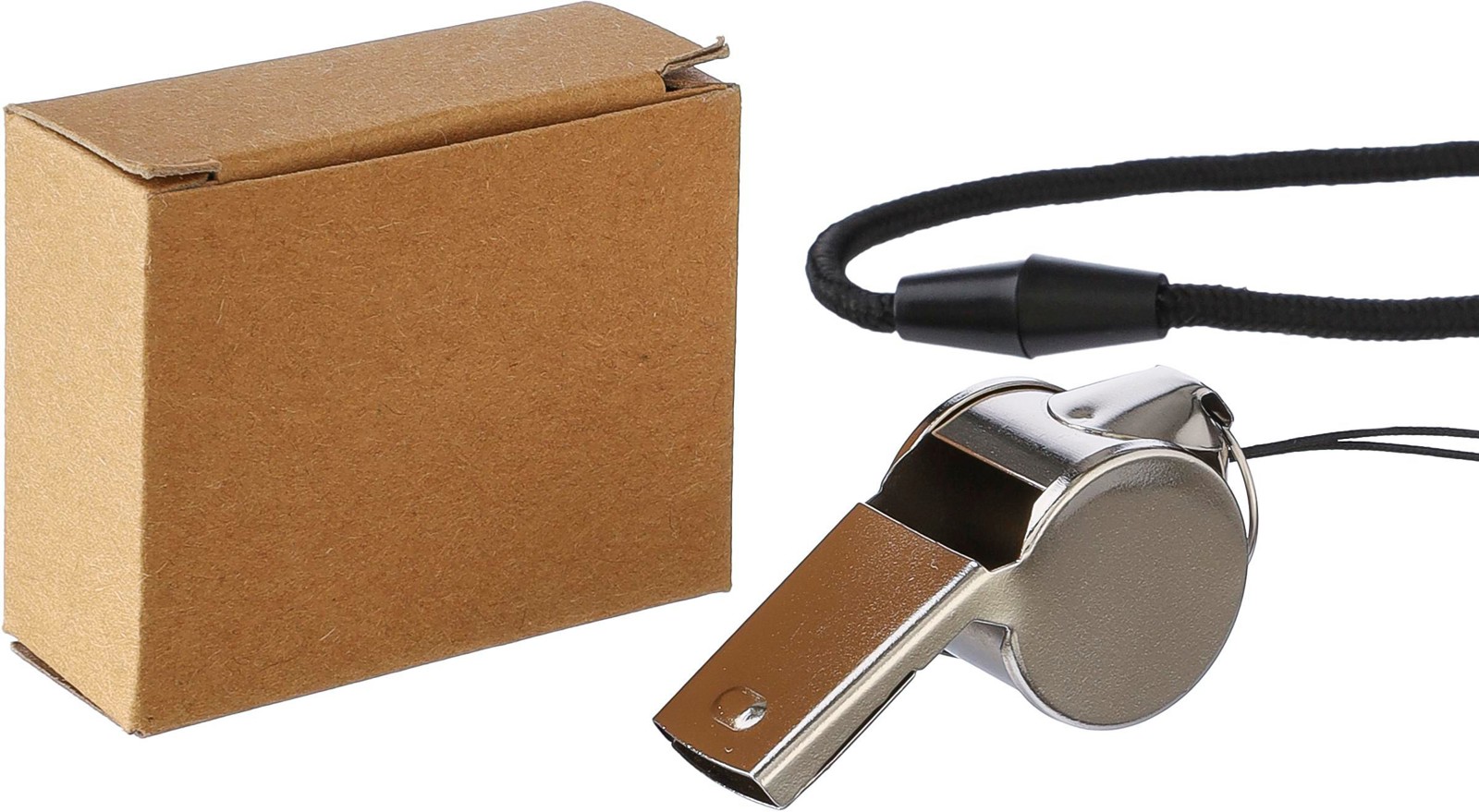Silbato de metal con cordón de poliéster y hebilla de seguridad de plástico. Presentado en una caja de cartón marrón.