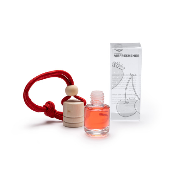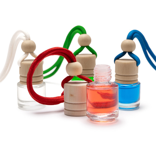 Purificador de ar com diferentes aromas em recipiente de vidro com tampa de madeira e cordão ajustável correspondente. Capacidade de 5 ml. Apresentação em caixa transparente.