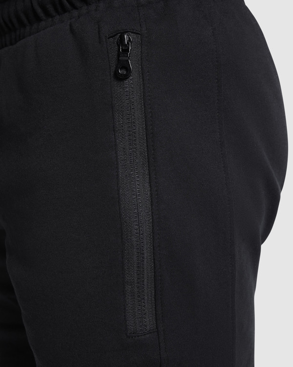 Calções desportivos em interlock. Cintura elástica com cordão ajustável e ilhós metálicos. Amplos bolsos laterais com fechos invertidos no mesmo tom. Bolso traseiro com botão de pressão. Costura dupla na bainha.