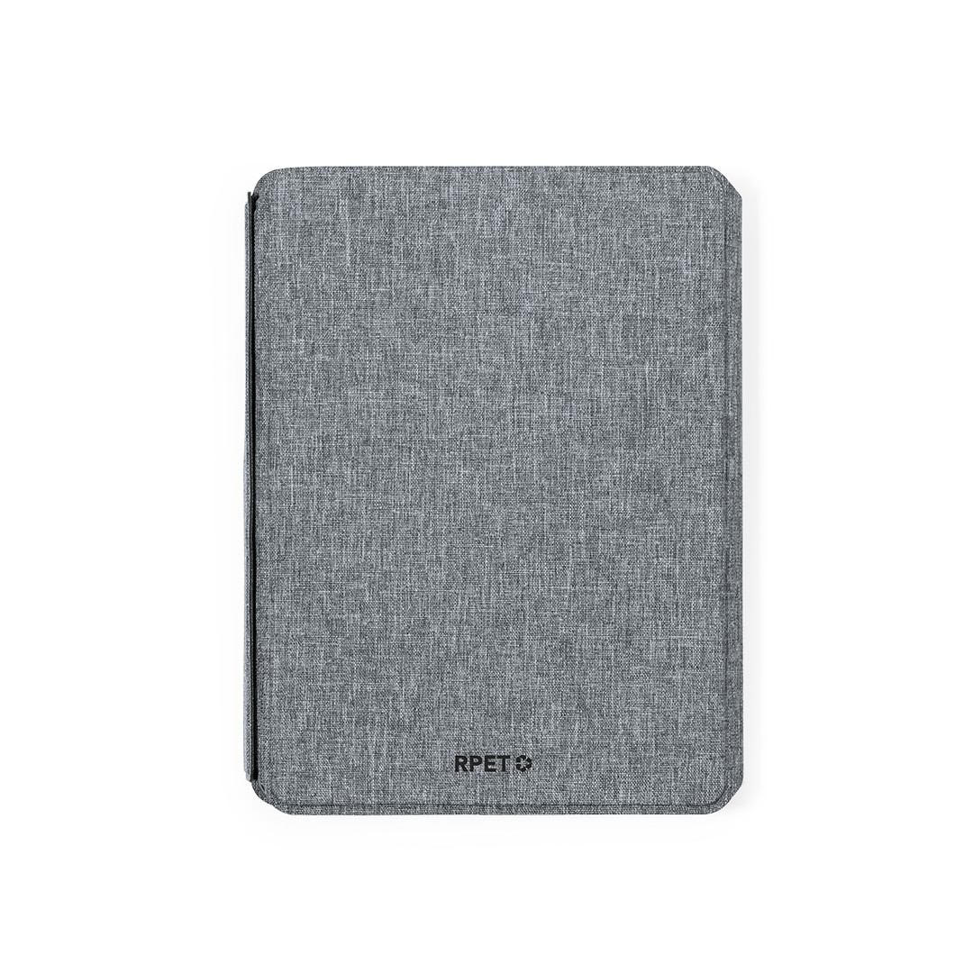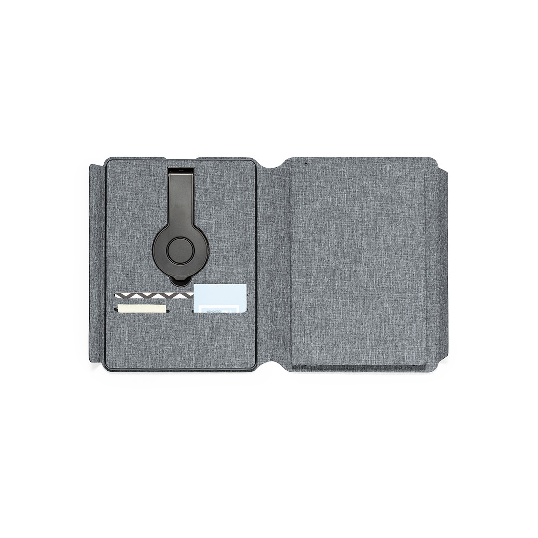 Pasta/bloco multifunção com fecho magnético fabricada em poliéster 300D RPET, elaborado a partir de plástico reciclado. Con etiqueta interior com distintivo RPET.Inclui carrgeador sem fios multiposição integrado na capa de 10W, com fixação magnética para poder usar o dispositivo durante o carregamento o mesmo e incluindo anel adesivo, válido para todos os dispositivos con tecnología Magsafe y Qi. Interior com carrgeador sem fios para smartwatch.Bateria integrada de 5.000 mAh de capacidade de carregamento, com porta Tipo C de entrada/saída e LEDs indicadores de estado de carregamento, cabo incluído.Interior com suporte para smartphone e vários compartimentos para cartões, incluídos suporte para esferográfica e bloco A5, com bloco de 64 folhas e disposição pautada.Apresentada em atrativa caixa individual de design.As capacidades apresentadas em todas as nossas baterias auxiliares externas são reais, incorporando todas elas baterias de grau A e não recicladas, com uma vida útil de pelo me