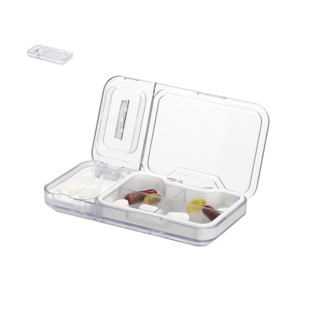 Organizador com 4 compartimentos internos, fechamento de segurança com bordas de silicone e lâmina para cortar comprimidos. Fabricado com um acabamento transparente. 4 Compartimentos