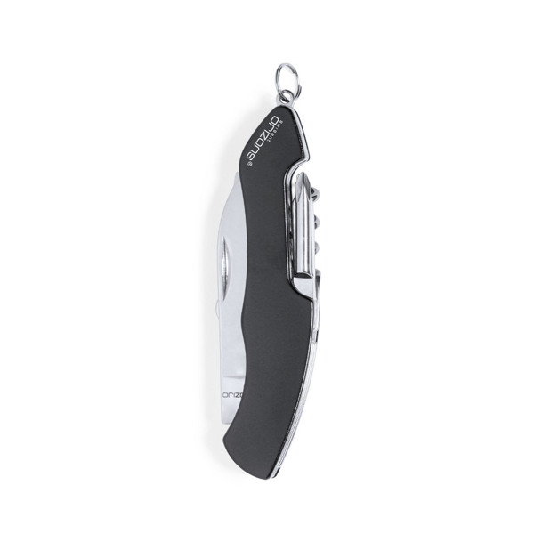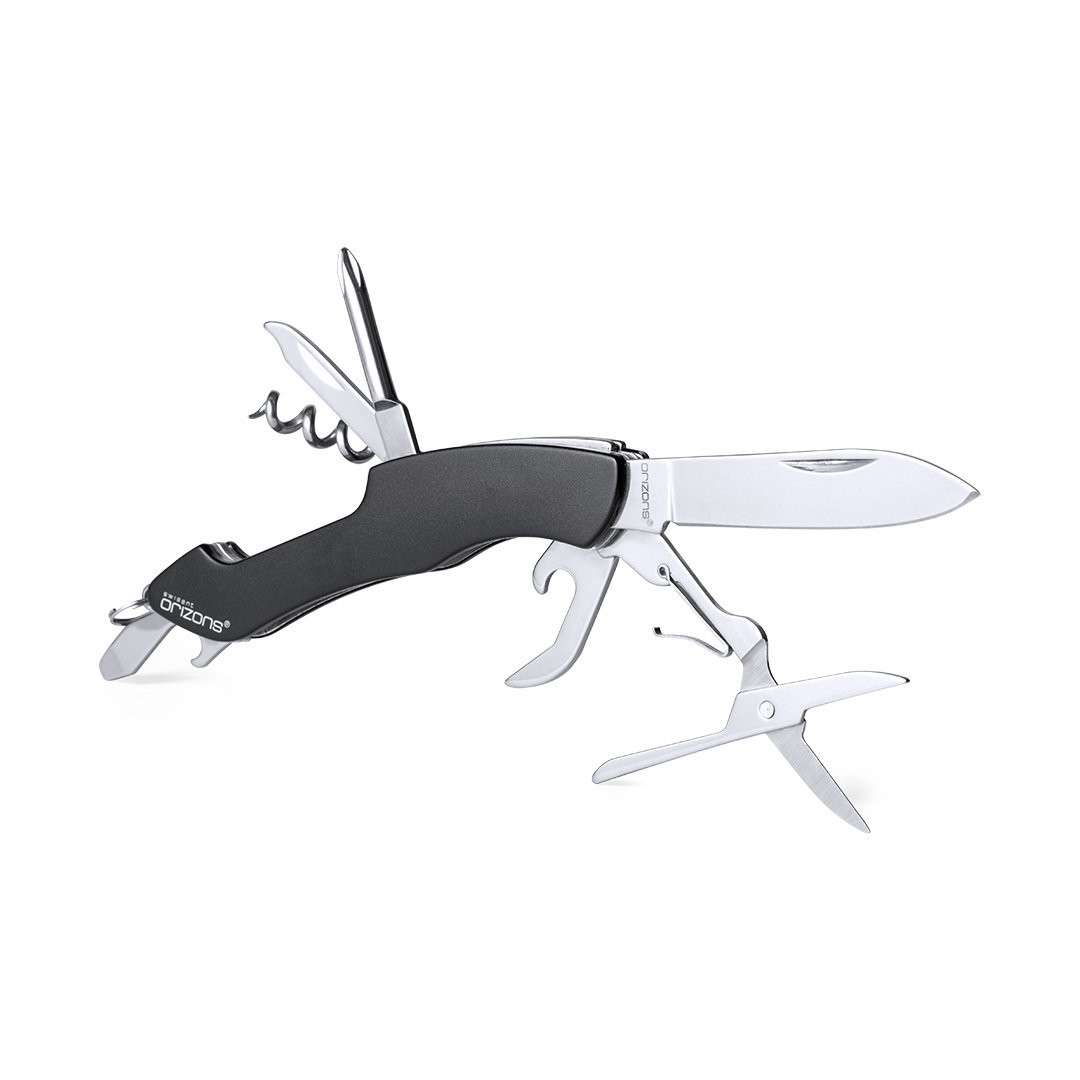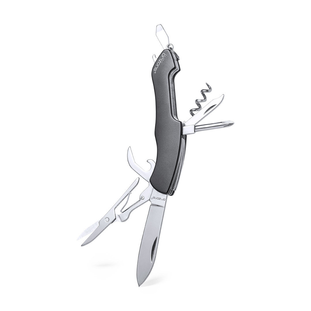 Faca de vários fins de propósito por orizons com acessórios de aço inoxidável de 10 funções e alça de alumínio em tons brilhantes. Com faca, tesoura, abridor de lata, abridor de garrafas com chave de fenda, chave de fenda, perfuração de arquivo e saca -rolhas. Com anel para chaveiro e apresentado em uma atraente caixa de design com o logotipo da marca. 10 Funções