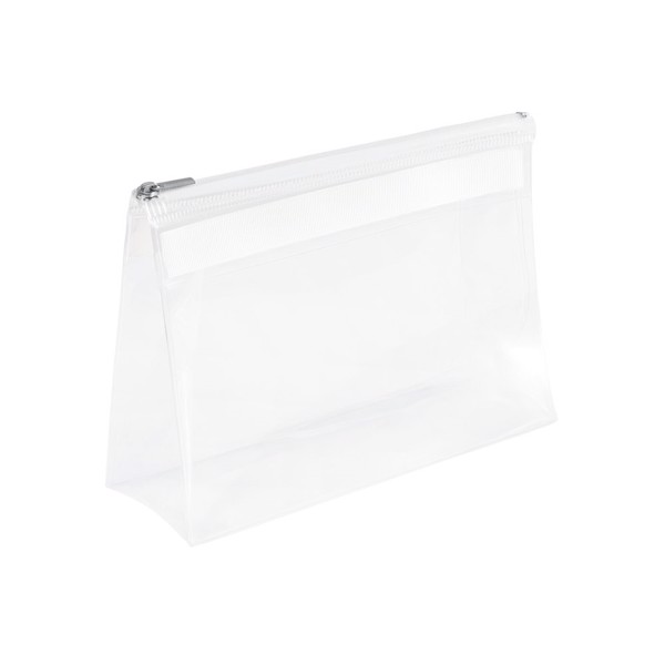Necessaire transparente em EVA com fecho de correr e puxador metálico. Apropriado para viagens de avião. 200 x 145 x 70 mm