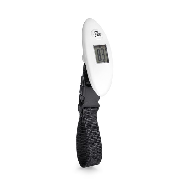 Mini balança digital em ABS para peso máximo de 40kg. Ideal para malas de viagem. Inclui 1 pilha CR2032. 37 x 100 x 27 mm