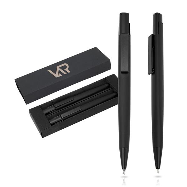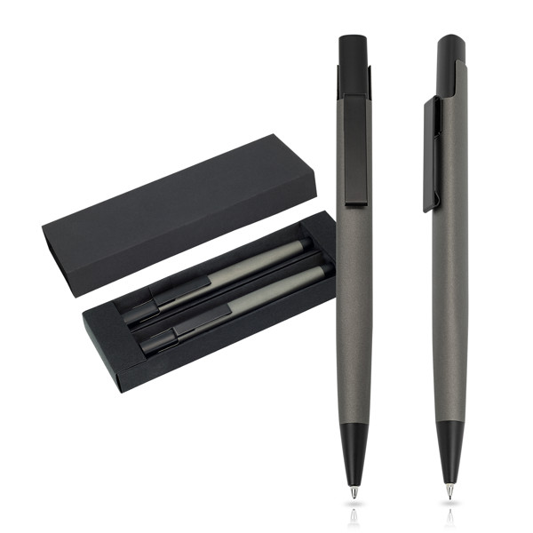 Conjunto de esferográfica e lapiseira de alumínio em estojo de oferta. Conjunto elegante com detalhes pretos em caixa de oferta de cartão. Composto por uma esferográfica de escrita preta, e uma lapiseira.