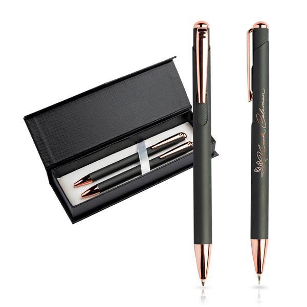 Conjunto de esferográfica e lapiseira em metal, estojo de oferta. Um conjunto inspirado na elegância, que combina uma esferográfica e uma lapiseira com detalhes metálicos. A gravação a laser confere a este conjunto um detalhe ainda mais glamouroso já que o underlayer irá combinar com os detalhes metálicos. A esferográfica é de escrita azul. Ambos os produtos de escrita funcionam em sistema pulsar. Inclui estojo com pala magnética.