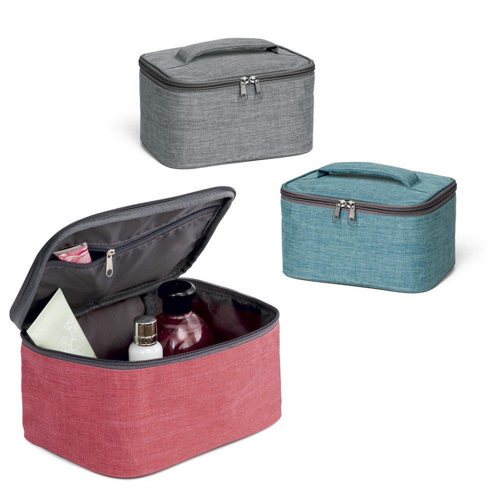 Necessaire em 300D de alta densidade com pega almofadada e fecho duplo. Interior forrado e bolso interior com fecho. 200 x 115 x 140 mm