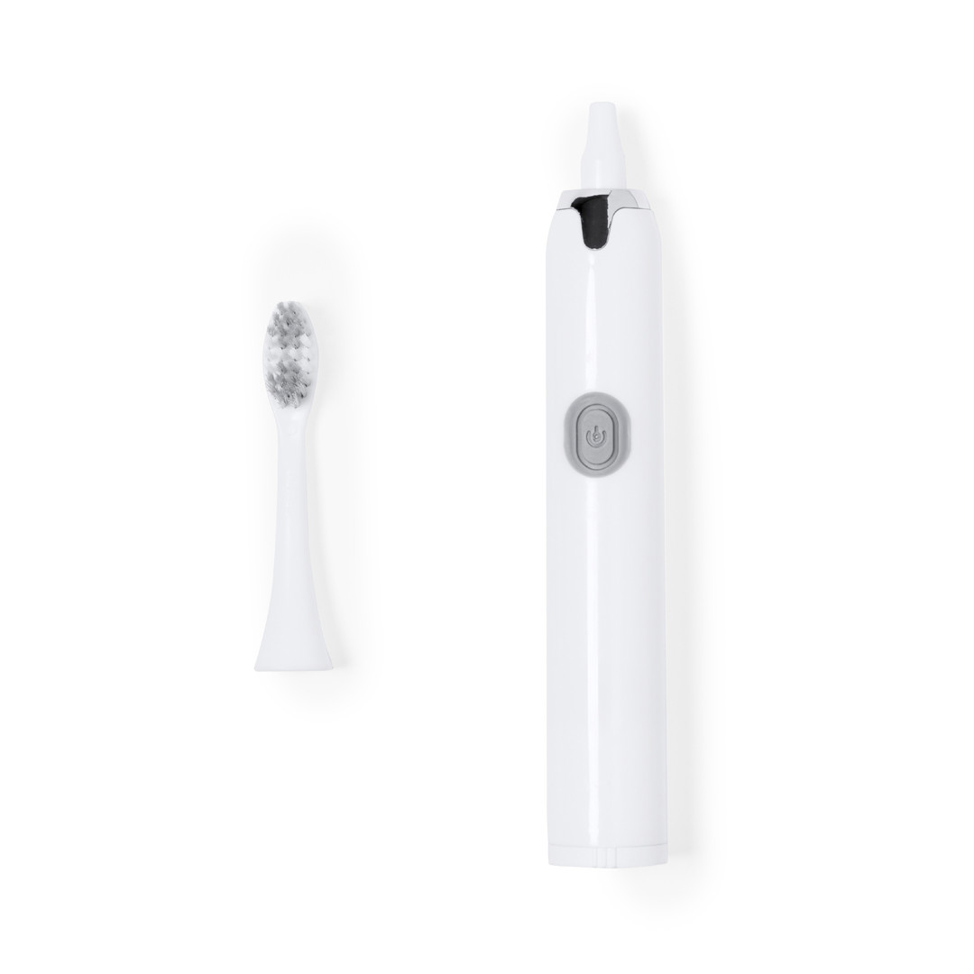 Prática escova de dentes elétrica portátil. Limpeza eficaz graças à sua função de vibração e cerdas agradáveis. Alimentada por 1 pilha AA (não incluída) inserida na base. Em branco e prateado, apresentada numa caixa de design kraft. 1 Pilha AA Não Incluídas
