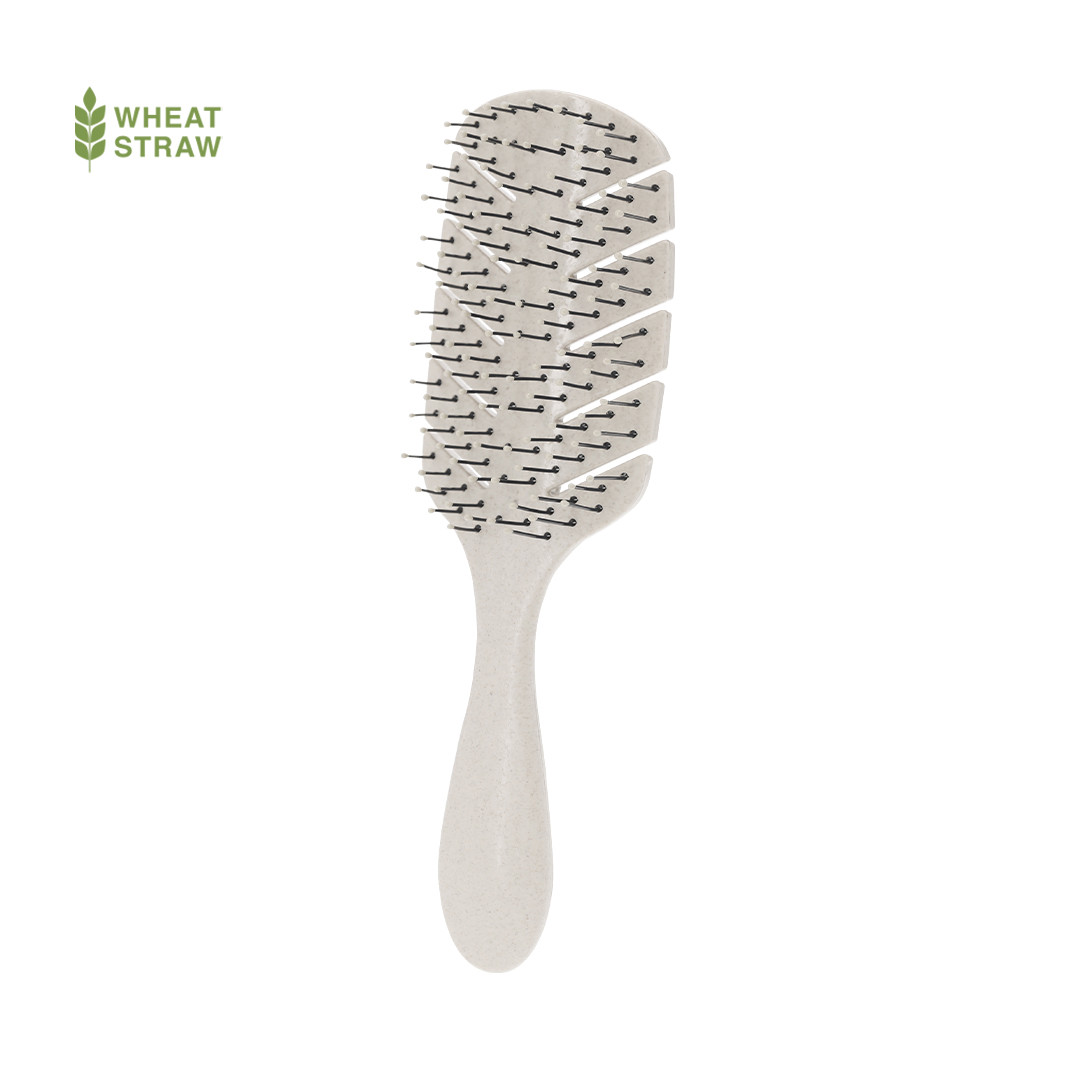 Escova Anti-embaraço e Desembaraçadora fabricada em cana de trigo. Com sistema anti-enredos, flexível e resistente que permite desembaraçar qualquer tipo de cabelo com máxima suavidade. Com um design ergonômico graças à sua forma semicircular e longos espinhos, adapta-se perfeitamente ao contorno da cabeça, facilitando o penteado de uma maior quantidade de cabelo em cada passada.A Cana de Trigo promove a utilização de matérias-primas naturais, reduzindo assim as emissões poluentes.