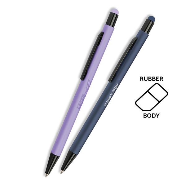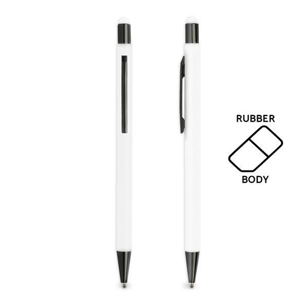 Esferográfica em alumínio com corpo com toque de borracha com touch. Escrita azul, sistema pulsar. Esferográfica de corpo fino e com toque delicado. Tem touch à cor do corpo e detalhes pretos. Personalize e veja o reconhecimento da sua marca a passar de mão em mão.