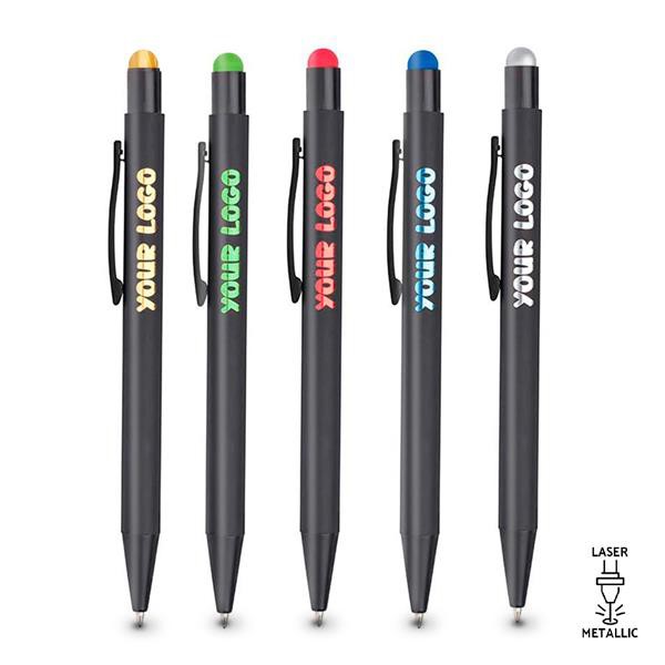 Esferográfica em alumínio com acabamento em borracha e touch colorido. O toque de borracha cria condições favoráveis para se tornar numa esferográfica agradável de usar. Destaque para o touch colorido no topo, que lhe atribuí versatilidade. Perfeita para personalização a laser, já que verá o efeito da gravação ficar a combinar com a cor do touch. Com sistema pulsar. Esta esferográfica é de escrita azul.