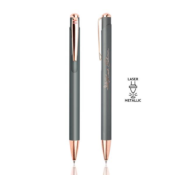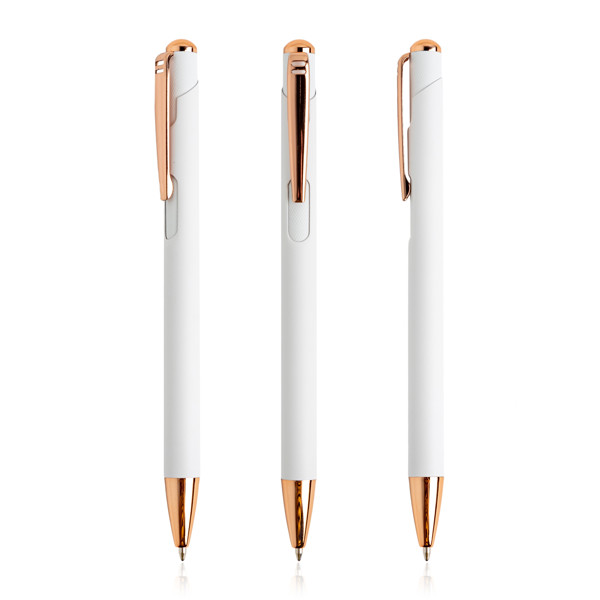 Esferográfica em metal, com detalhes rosa gold. Uma esferográfica feminina, com cores modernas e atrativas. Os detalhes rosa gold atribuem-lhe destaque e elegância. Na gravação a laser, o seu design ficará a combinar com os detalhes. Com sistema pulsar. Esta esferográfica é de escrita azul.