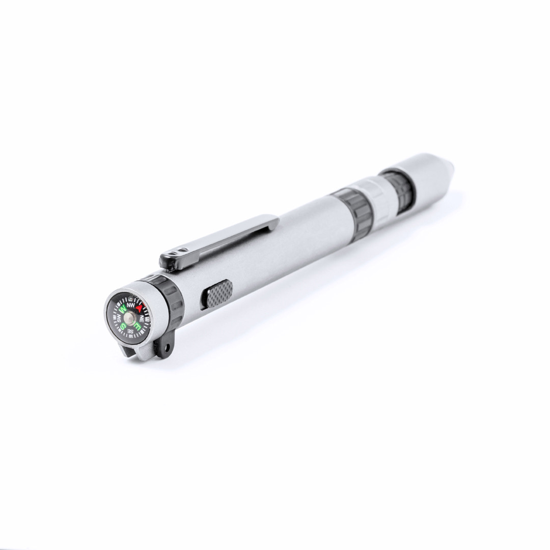 Esferográfica prática e multifuncional com 7 utilizações. Inclui: suporte para telemóvel, ponteiro, carga de tinta azul, lanterna alimentada por pilha tipo botão (incluída), bússola, chave de fenda plana e philips. Apresentado individualmente em caixa de design kraft. 1 Acessório. 7 Funções. Pilhas Botão Incluídas