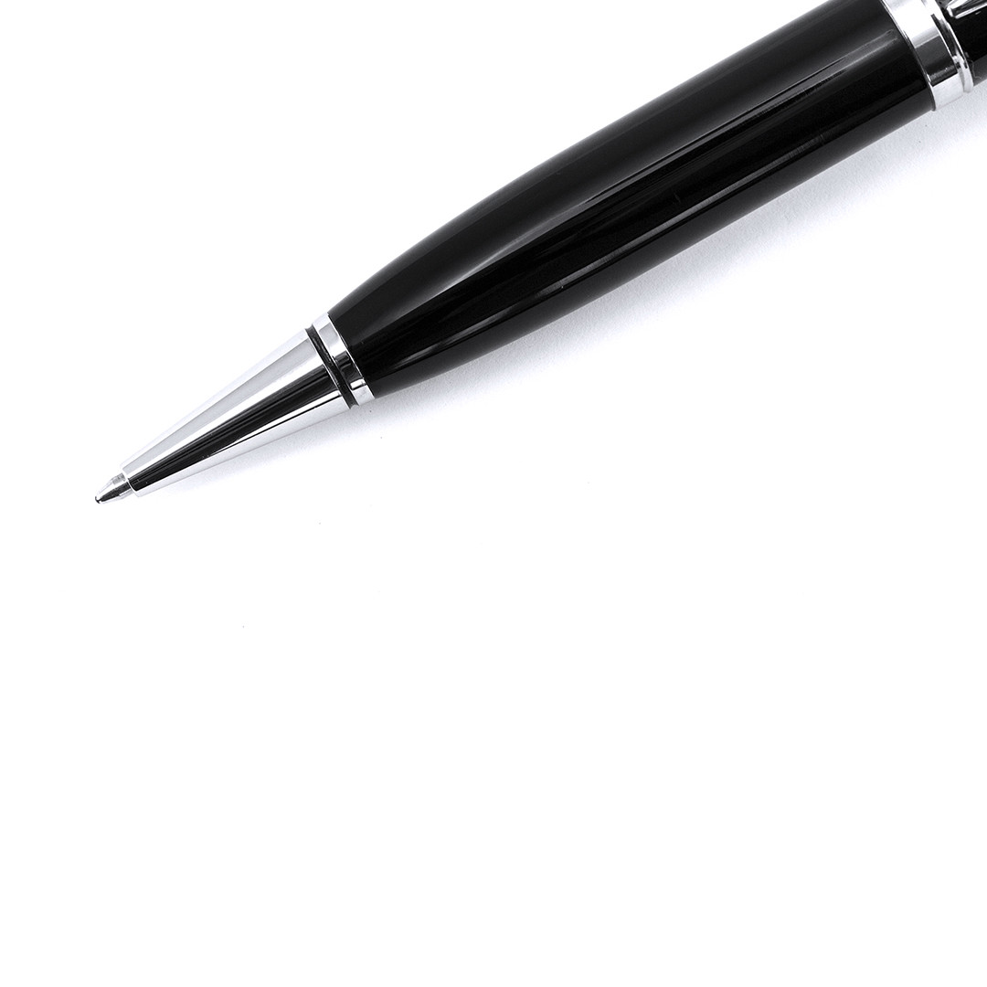 Esferográfica tecnológica multifunções em cores sóbrias, com memória USB de 16GB de capacidade integrada na tampa e ponteiro de borracha macio da mesma cor. Corpo em acabamento metálico brilhante, com abertura rotativa e tinta azul. Apresentado numa elegante caixa de cartão branca com fecho magnético e interior em esponja macia.