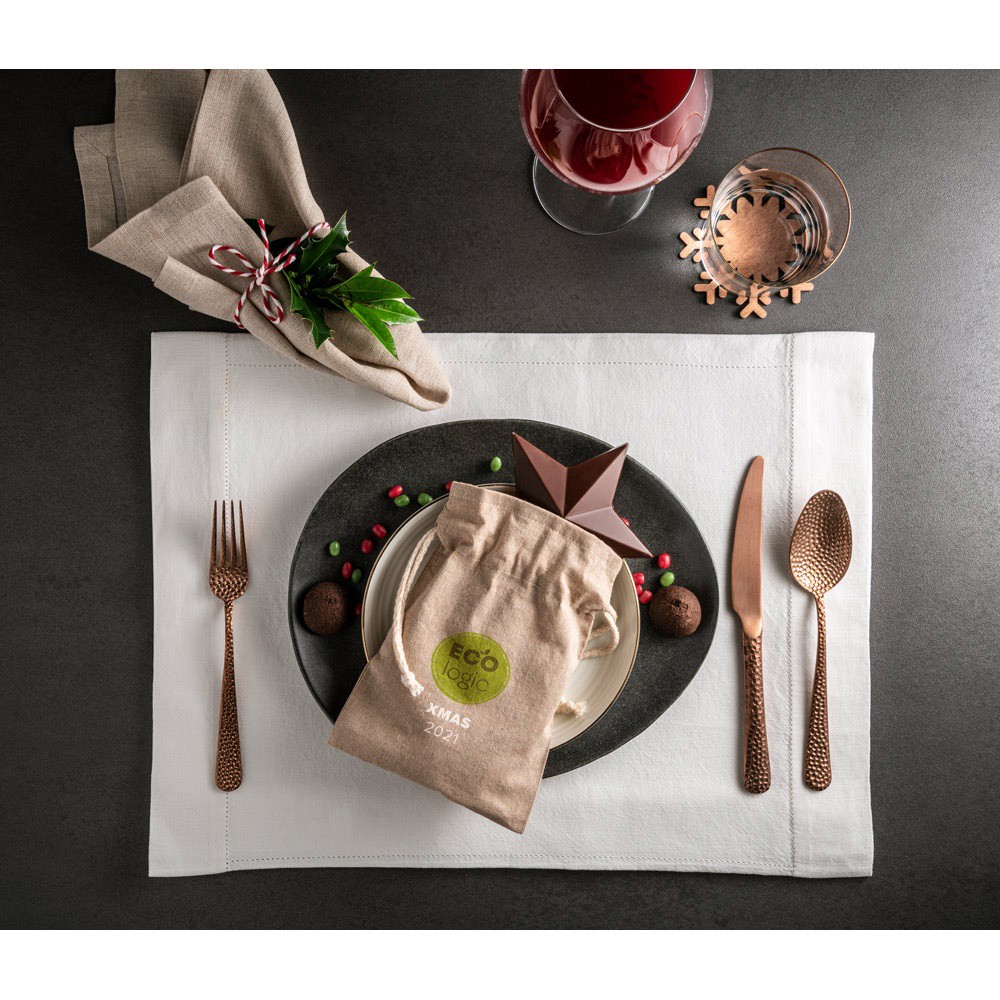 Saco de oferta em algodão reciclado (70%) e poliéster (30% rPET) (140 g/m²) com cordão em algodão. Saco reutilizável ideal para pequenos presentes. O algodão reciclado é não tingido. A matéria-prima é usada na sua forma e cor originais, sem o uso de produtos químicos de tingimento ou branqueamento, contribuindo para um menor impacto. 140 x 200 mm