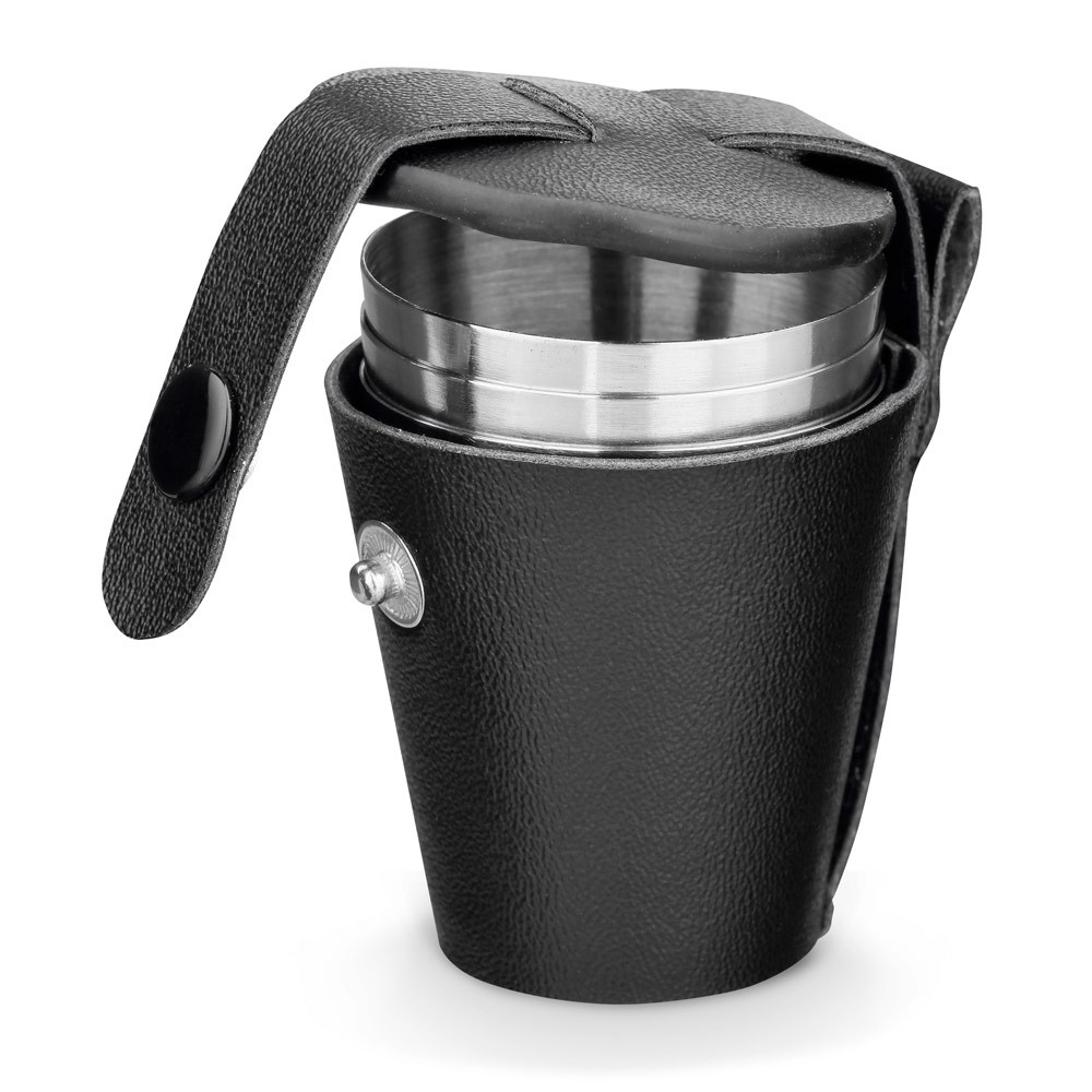 Conjunto de 4 copos em aço inoxidável com bolsa para transporte em PU e com capacidade até 25 mL. Fornecido em caixa de oferta. ø44 x 62 mm | Caixa: 45 x 66 x 45 mm