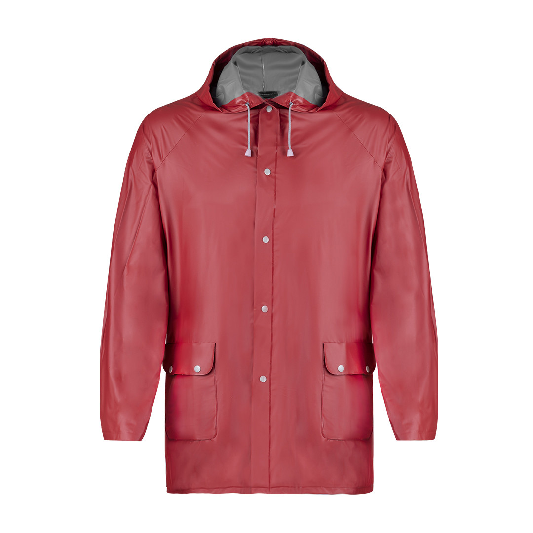 Capa de chuva em PVC resistente com acabamento selado em calor em uma ampla gama de tons. Com capuz e cordas, fechamento de botões e bolsos. Disponível nos tamanhos M-L, XL-XXL.
