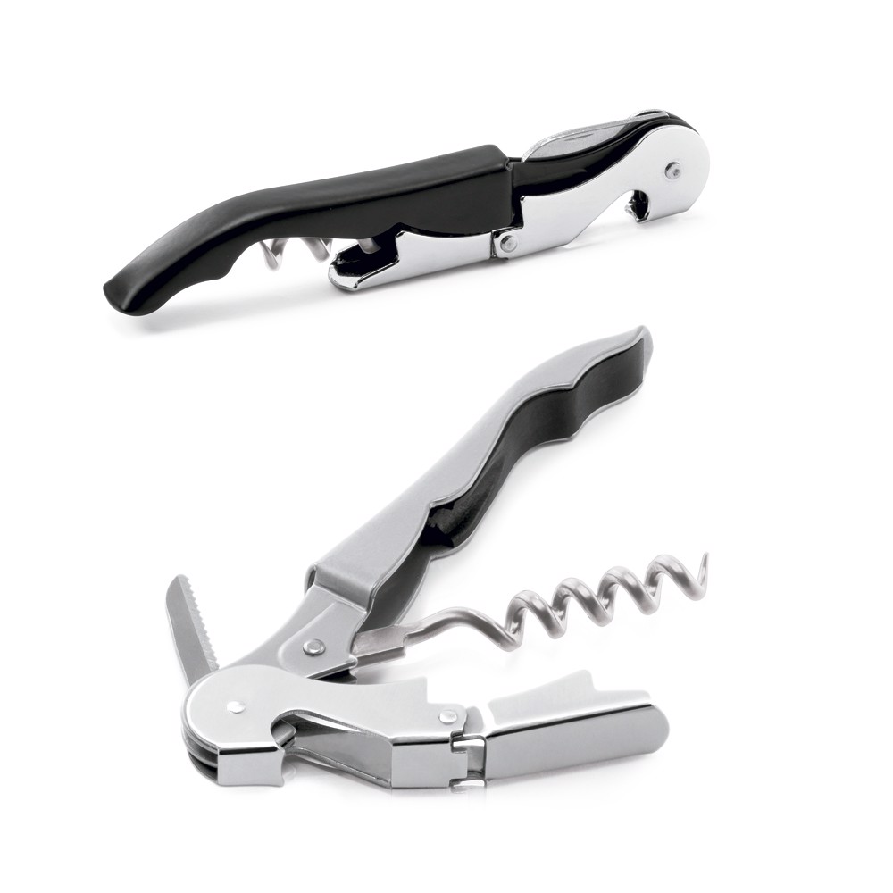 Saca-rolhas em metal e PP com abre-cápsulas, canivete de escanção e espiral em aço inoxidável. 121 x 20 x 12 mm