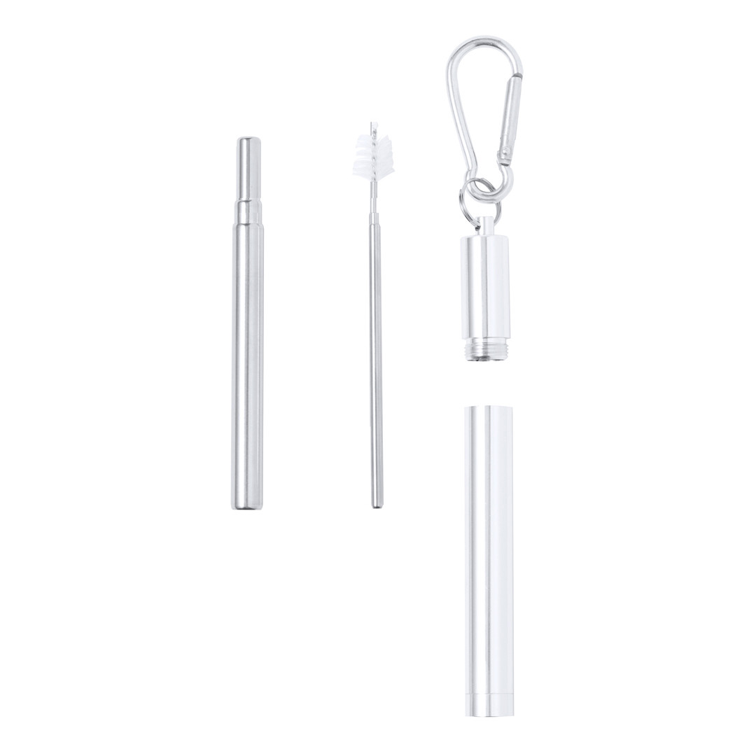 Palhinha reutilizável de aço inoxidável e extensível com bocal de silicone. Com acessório limpador incluído e apresentado num estojo correspondente com mosquetão para transporte. Extensível. Reutilizável. Limpador Incluído