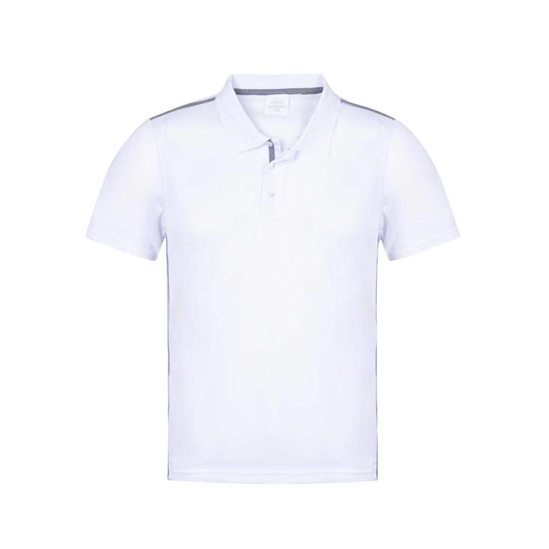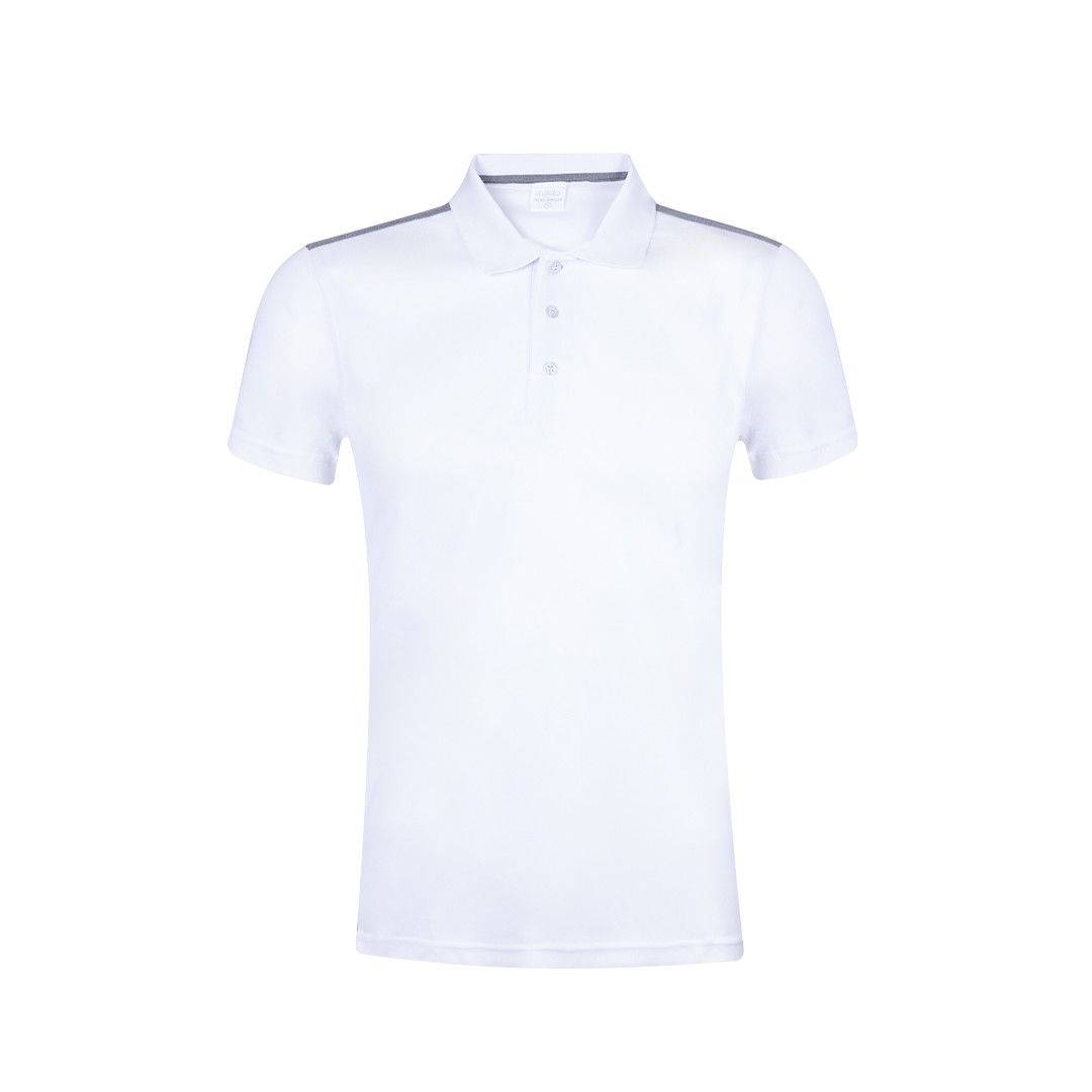 Camisa Polo Técnica para Adultos em Poliéster respirável 180g/M2. Em um design elegante de duas cores, com corpo em cor branca e detalhes em cinza. Disponível nos tamanhos S, M, L, XL, XXL. Cor branca especialmente fabricada para impressão de sublimação. Respirável