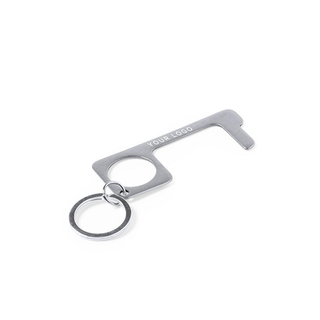 Porta-chaves higiénico anti-contacto, fabricado em resiste aço inox. Especialmente desenhado para evitar tocar com as mãos em superfícies de uso comum (puxadores das portas, interruptores, torneiras públicas, caixas multibanco...). Com cómodo recorte para o dedo e apresentado em bolsa individual. Recomendado para a gravação a laser.