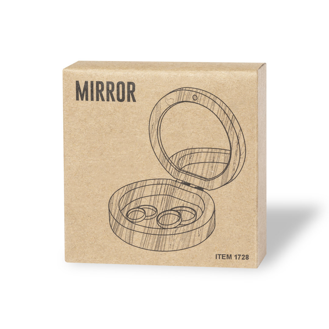 Porta-jóias da linha nature, com carcaça fabricada em bambu. Com espelho interior 1X e fecho magnético. Apresentado numa caixa individual de design kraft.