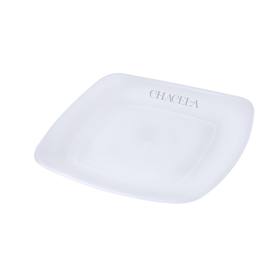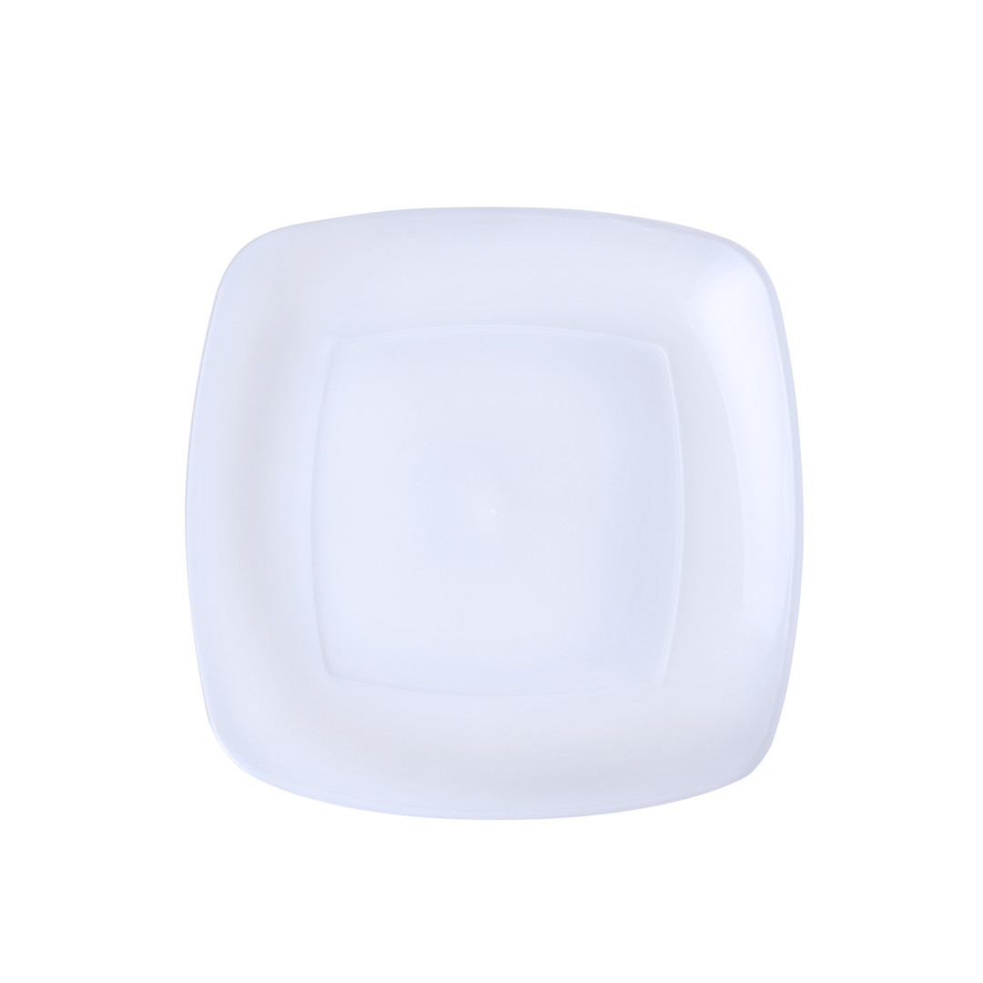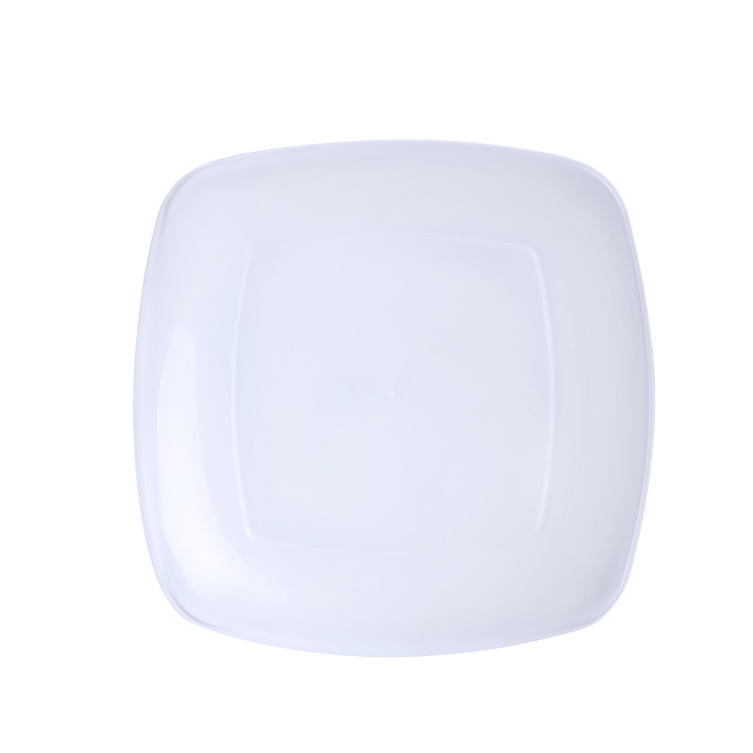 Prato plano em resistente e flexível material PP. Reutilizável e com acabamento translúcido quadrado.
