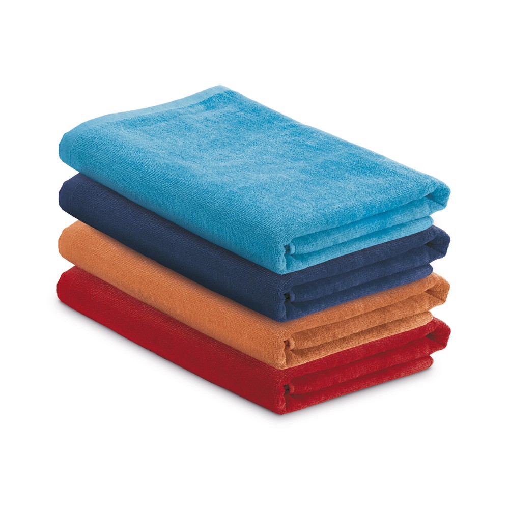Toalha de praia em veludo de algodão (320 g/m²), disponível em várias cores. Fornecida em saco de non-woven (80 g/m²). 1500 x 750 mm | Saco: 330 x 415 x 100 mm
