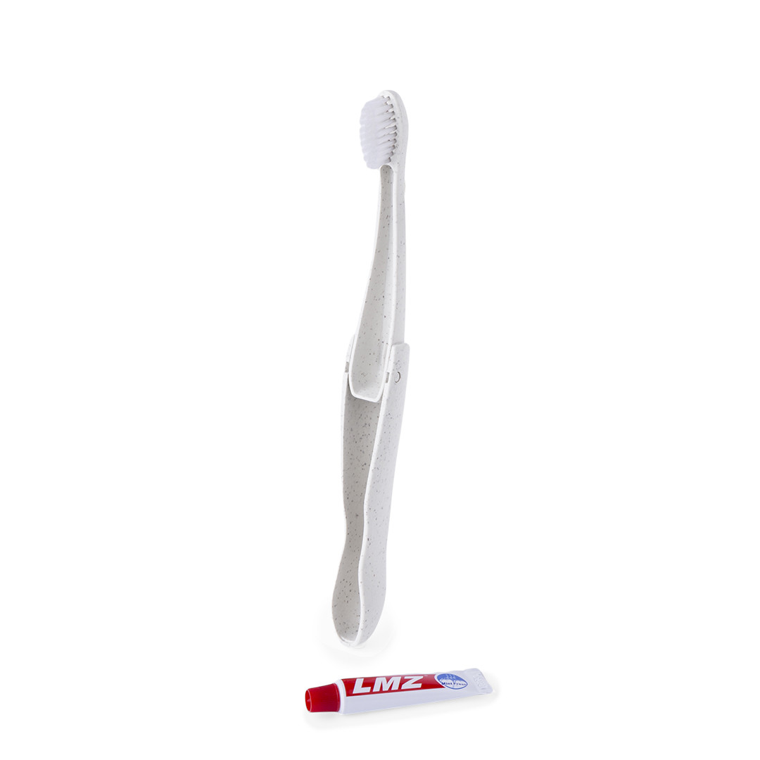 Prática escova de dentes dobrável fabricada em resistente palha de trigo. Inclui compartimento para guardar um tubo de pasta de dentes de 6g (incluído).A palha de trigo promove a utilização de matérias-primas naturais, reduzindo assim as emissões poluentes. Dobrável. Escova Dentes Palha de Trigo/ PP. Pasta Dentária 6 gr