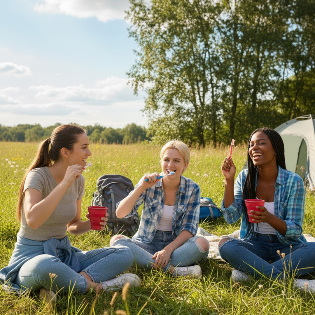 Conjunto de escova de dentes e copo dobrável. Inclui uma escova de dentes feita de PP dobrável para reduzir o espaço e um copo dobrável de silicone, apresentado num saco transparente de PVC com fecho fecho. Escova Dentes Dobrável. Copo Dobrável, Silicone, 200 ml