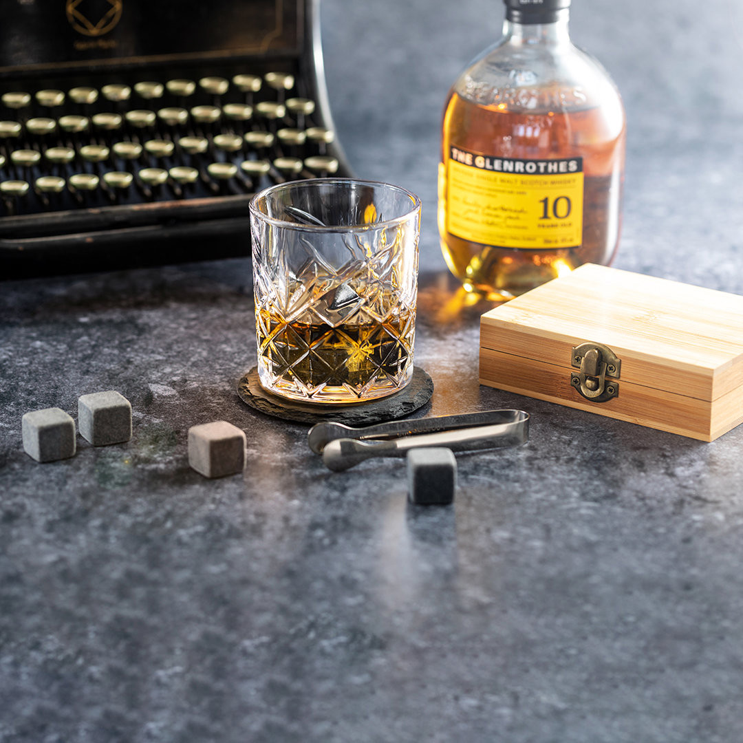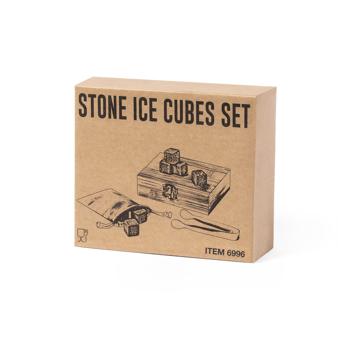 Set de 9 cubos de gelo reutilizáveis. Fabricados em pedra esteatita natural, também conhecida como pedra ou rocha sabão, que mantém a bebida fria sem alterar as suas propriedades por não diluir o seu conteúdo em água, bem como manter o sabor original da mesma. Inclui pinça de aço inoxidável e bolsa de algodão. Apresentado numa caixa de bambu. Reutilizável. 9 Peças. Pinças Aço Inox e Bolsa Algodão