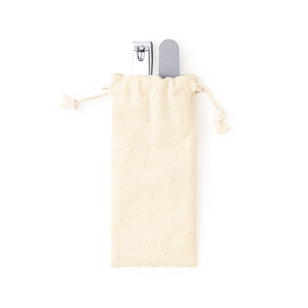 Conjunto de manicure com corta-unhas e lima. Apresentado numa bolsinha individual com fecho de cordões em algodão cru. 2 Acessórios