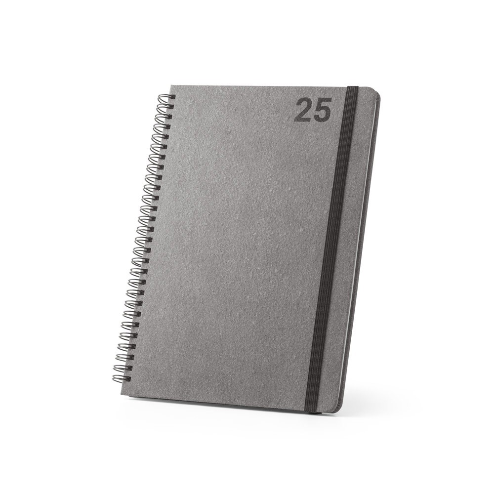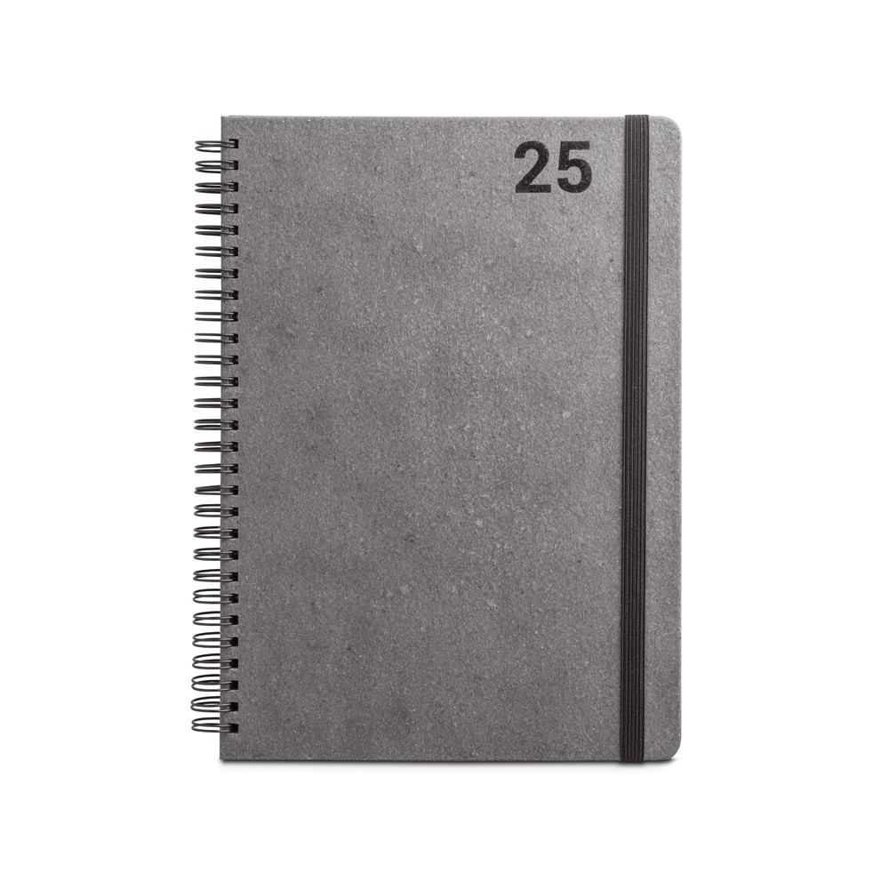 Agenda B5, com argolas, em pele (58% reciclada). Possui um elástico para fecho da agenda. Está organizada num plano semanal, com páginas (70 g/m²) feitas de material certificado FSC™ e outros materiais controlados. 175 x 245 mm