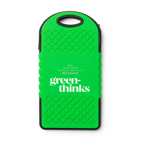 Bateria externa solar, resistente a respingos de água e com alta capacidade de carga. 4000 mAh. LED indicador de carga e luz. Saída de corrente 5 W/2,1 A.