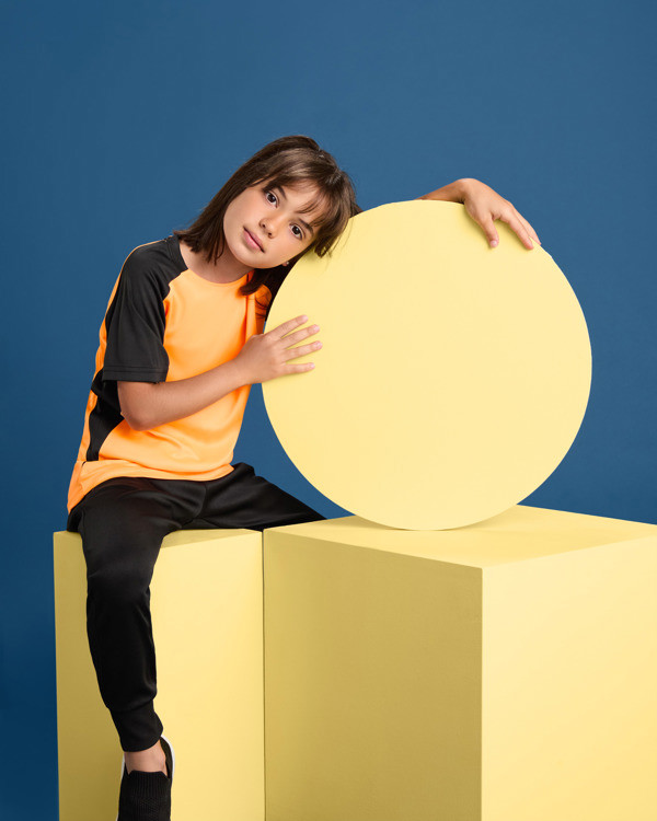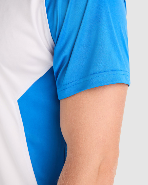 T-shirt técnica de manga reglan.1 – Gola redonda com tapa costuras no mesmo tom.2 – Mangas e encaixes laterais em contraste.