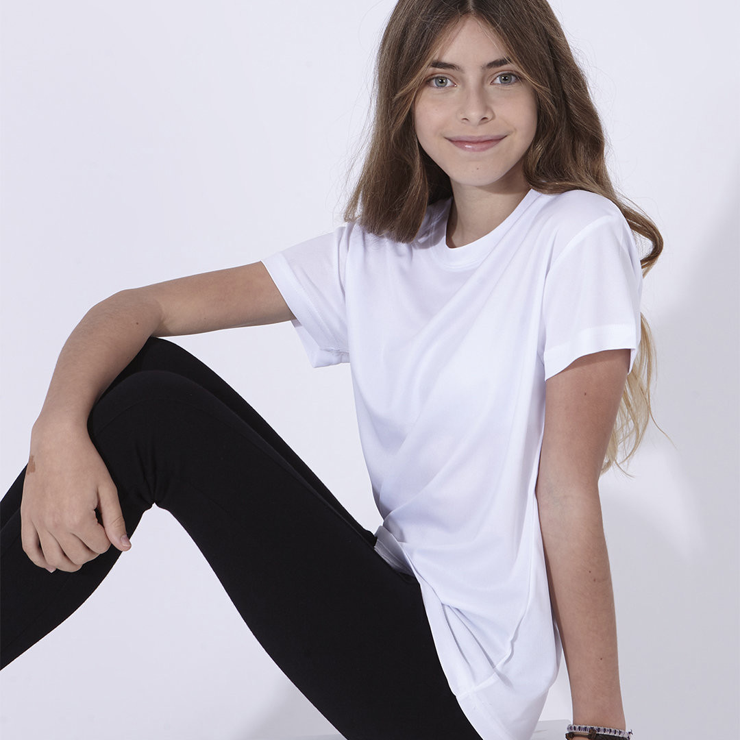 T-shirt para rapazes em material poliéster 100% respirável de 140g/m2 com textura de algodão. Especialmente concebido para marcação por sublimação e disponível nos tamanhos 4-5, 6-8, 10-12. Respirável