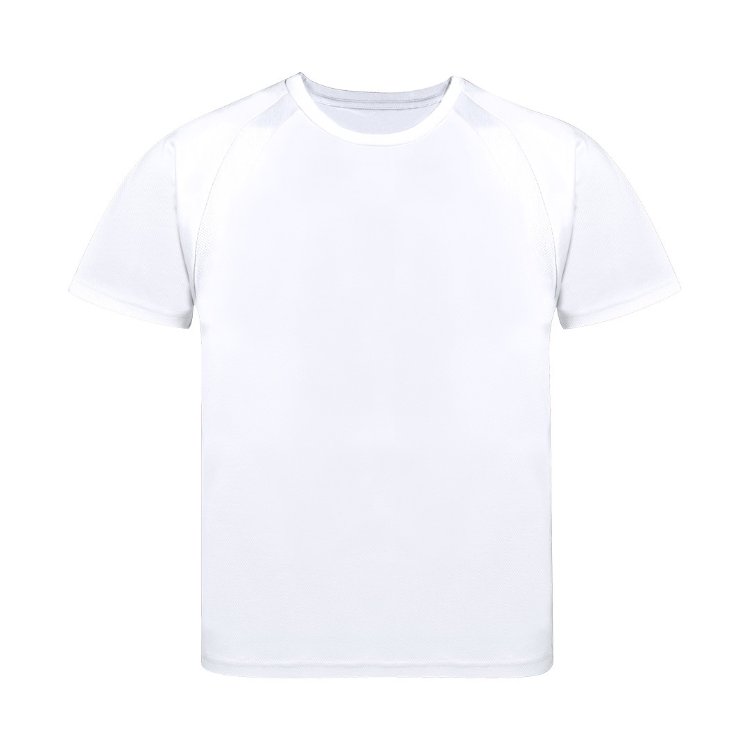 T-shirt técnica para criança em material 100% poliéster transpirável de 135g/m2. Com manga ranglan, gola redonda e com faixas frontais e laterais em tecido transpirável microperfurado. Disponível nos tamanhos 4-5, 6-8, 10-12. Respirável