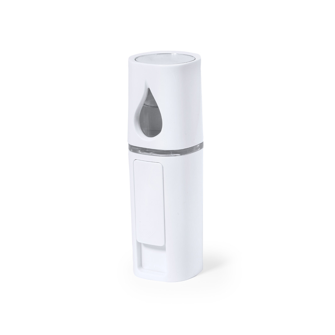 Fantástico pulverizador de bolso. Refrescante e hidratante pulverizador elétrico cria uma leve névoa para pulverizar sobre a pele, deslizando a tampa protetora. Recipiente recarregável de 15 ml com tampa de rosca, indicador de nível e uma elegante luz roxa. Tampa espelhada. Alimentado por uma pilha de 250 mAh, cabo incluído. Apresentado numa caixa individual. Luzes Led. 15 ml. Bateria 250 mAh